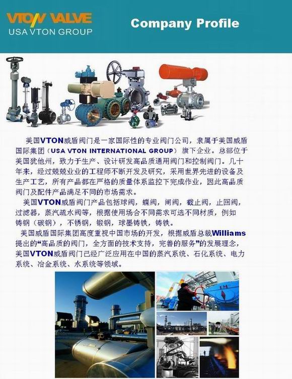 美國威盾國際集團(tuán)高度重視中國市場的開發(fā),根據(jù)威盾總裁Williams提出的“高品質(zhì)的閥門,全方面的技術(shù)支持,完善的服務(wù)”的發(fā)展理念,美國VTON威盾閥門已經(jīng)廣泛應(yīng)用在中國的蒸汽系統(tǒng)、石化系統(tǒng)、電力系統(tǒng)、冶金系統(tǒng)、水系統(tǒng)等領(lǐng)域。